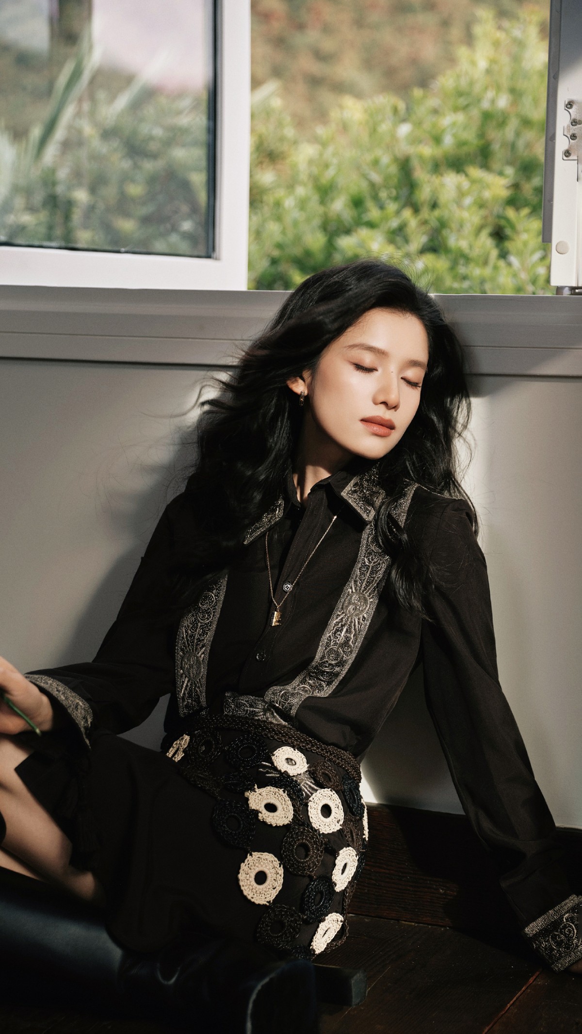 一身深棕色穿搭低调却不简单,领口和袖口那些精致刺绣,像是从老祖宗的藏宝图里偷来的神秘符号,既古典又带点“你猜我背后有什么故事”的小傲娇。而那条黑色短裙更是心机满分:大小不一的圆形图案错落排布,乍一看像夜空中的星轨图,细看又像某种摩斯密码——反正我破译不出来,只知道它让整套look瞬间灵动了起来。