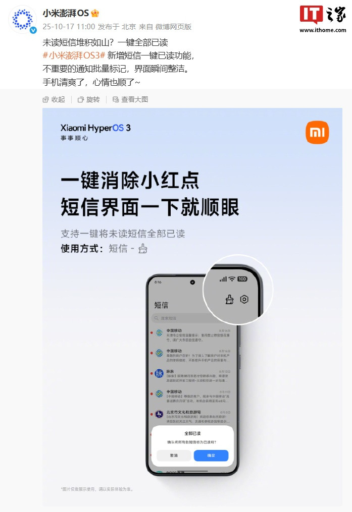 IT之家注意到,小米澎湃OS官方微博曾宣布在OS3系统中推出“短信一键已读”功能,不重要的通知可批量标记,界面瞬间整洁。