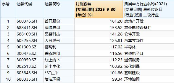 9月涨幅排名前十股票依次是首开股份(维权)、海博思创、品茗科技、天普股份、德明利、香农芯创、线上线下、蓝丰生化、*ST正平(维权)、复洁环保。其中,前9只股票单月股价完成翻倍。