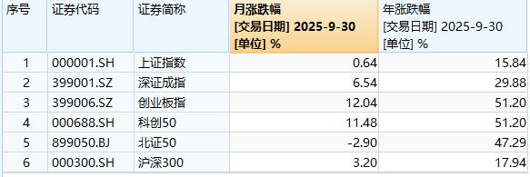 数据显示,截至9月30日收盘,上证指数报3882.78点,单月上涨0.64%;深证成指报13526.51点,单月上涨6.54%;创业板指报3238.16点,单月上涨12.04%。