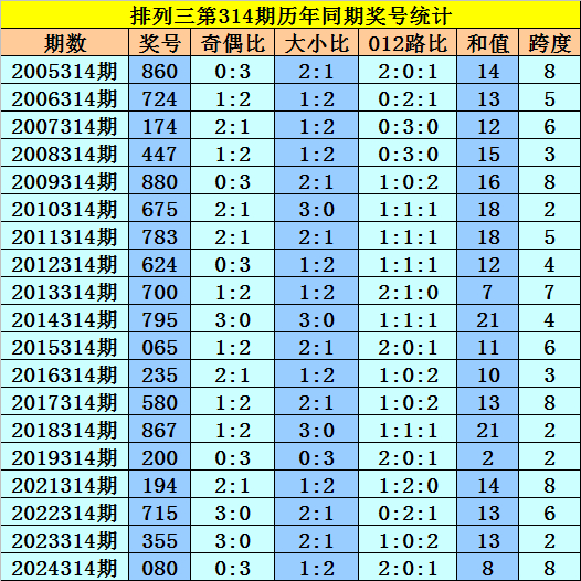 开奖回顾:排列三第2025313期开出奖号445,奖号012路比为0:2:1,大小比为1:2,奇偶比为1:2,最近三年第314期同期开出奖号为:第2022314期:715、第2023314期:355、第2024314期:080。