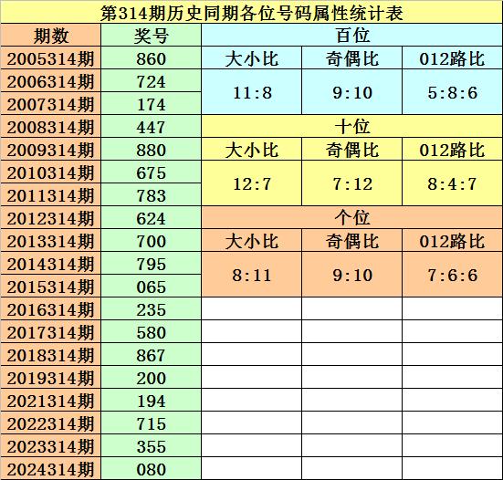 在第314期历史同期开奖中,号码0-9出现频次从高到低分别为:号码0→10次;号码7→9次;号码5→8次;号码8→7次;号码4→6次;号码6→5次;号码2→4次;号码1、3→3次;号码9→2次。一般来说,表现最热的号码:0578中至少出现1个奖号。同时奖号不会全部出现在表现最冷的号码中。