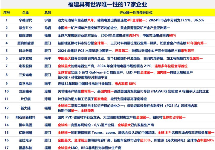 从宁德时代的电池到福耀玻璃的车窗,从片仔癀的药方到新大陆的二维码,福建17家“世界唯一”企业的崛起,是技术深耕与政策东风共振的结果。两岸融合打破壁垒,十五五计划指明方向,这些企业正从“福建龙头”成长为“全球标杆”。需要特别说明的是,本文仅客观分析产业与政策逻辑,企业发展受市场环境等多重因素影响,不构成任何投资参考。你身边还有哪些福建“隐形冠军”?评论区分享,点赞收藏,跟踪中国智造新动态。